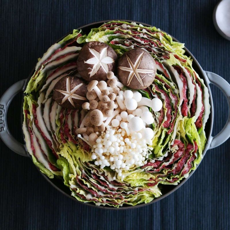 “밀푀유 나베”는 아름다운 모양 때문에 가장 인기 있는 요리 중 하나입니다. “밀푀유”는 “치바”를 뜻하는 프랑스어이고 “나베”는 퐁듀를 뜻하는 일본어의 조합입니다. 그대로 배달되는 요리였습니다. 훌륭한 맛 때문에 생일 파티나 손님 음식으로 제격입니다.